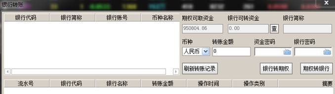 交易软件资金划转:登录期权交易软件点击交易窗口右上方“银”字即可进入银衍转账窗口。